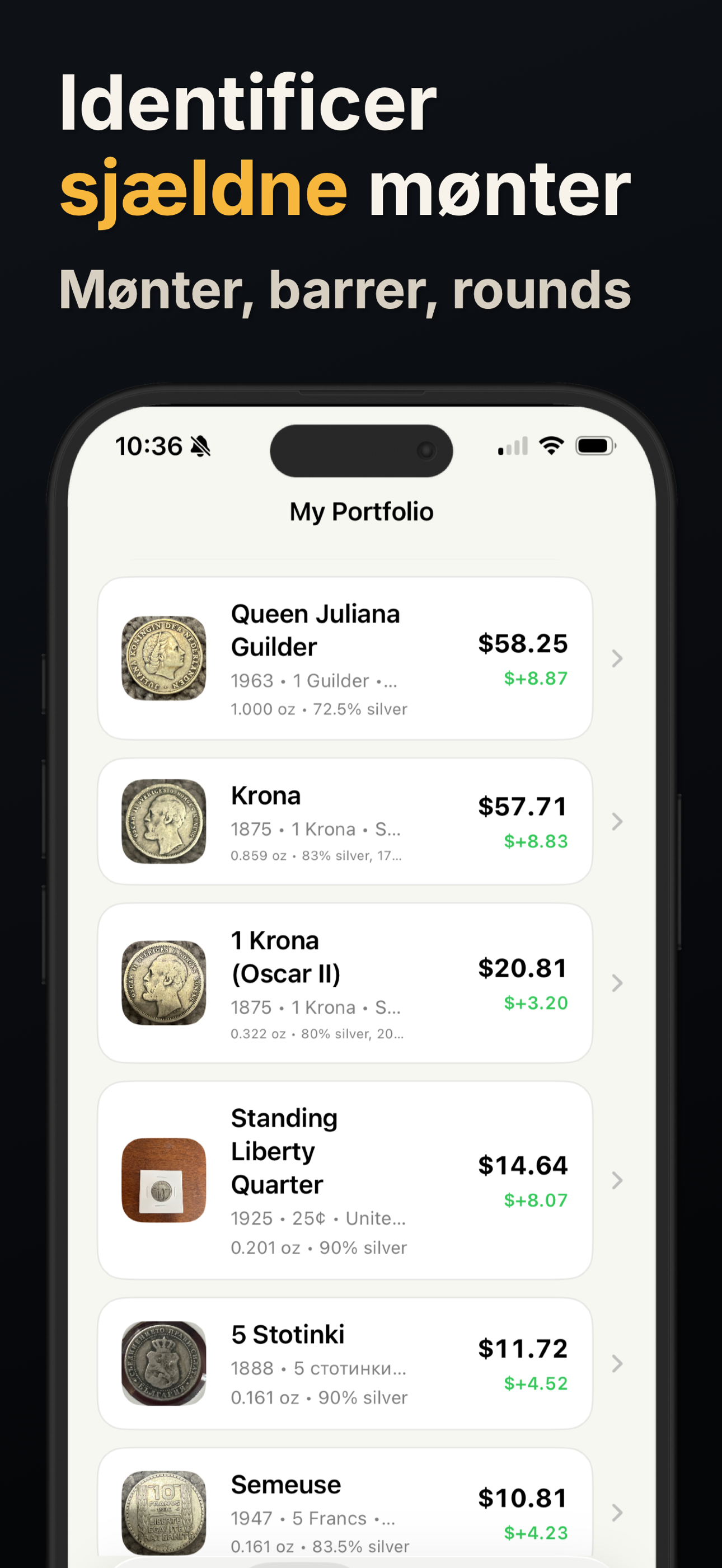 Hver scanning kan vise møntens navn, land, periode, pålydende værdi, metalsammensætning og et værdiestimat, når det er tilgængeligt. Derefter kan du gemme resultatet eller fortsætte din research fra et klarere udgangspunkt.
