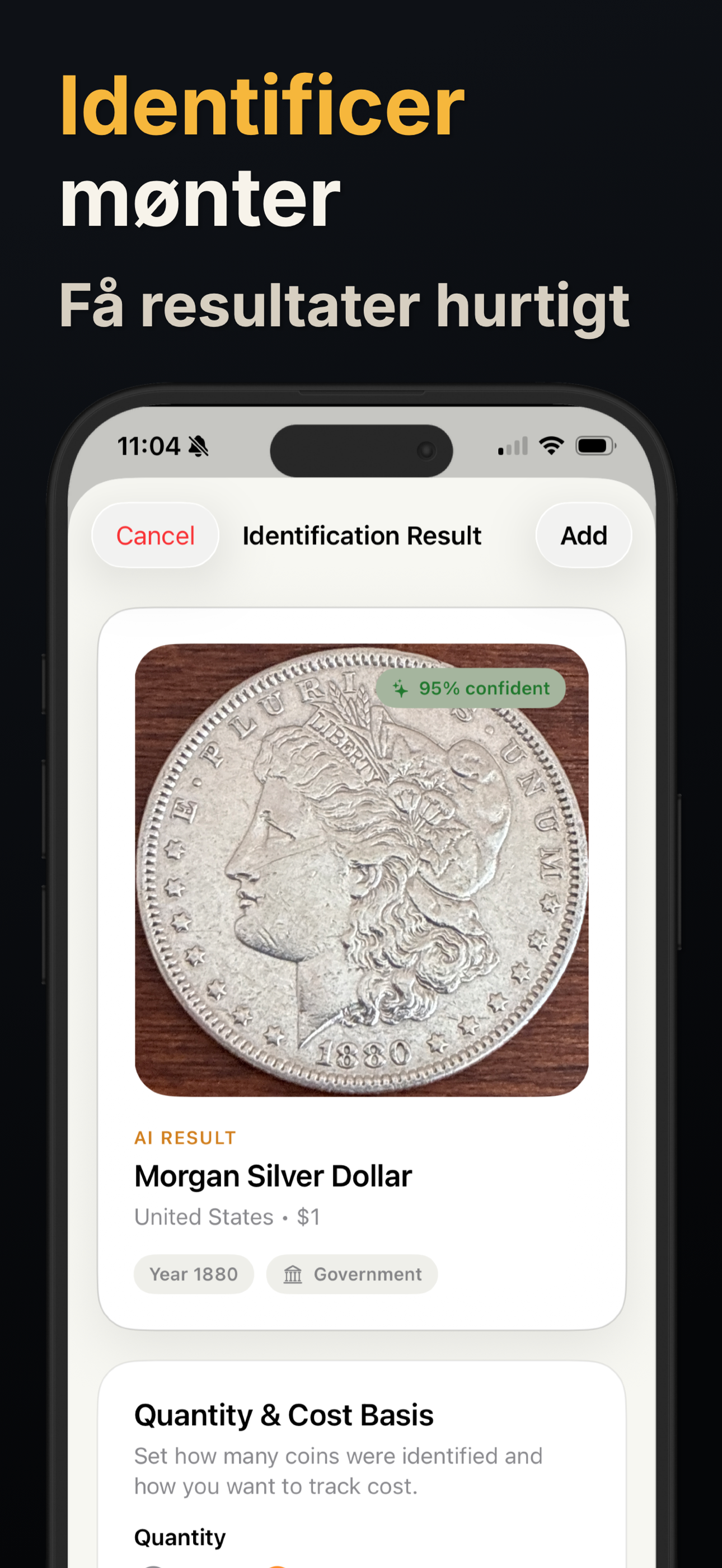 Hver skann kan vise myntnavn, land, datointervall, valør, metallsammensetning og et verdiestimat når det er tilgjengelig. Deretter kan du lagre resultatet eller fortsette researchen fra et klarere utgangspunkt.
