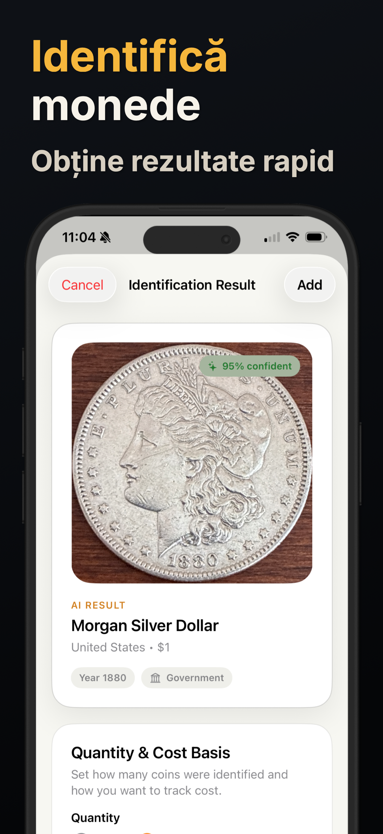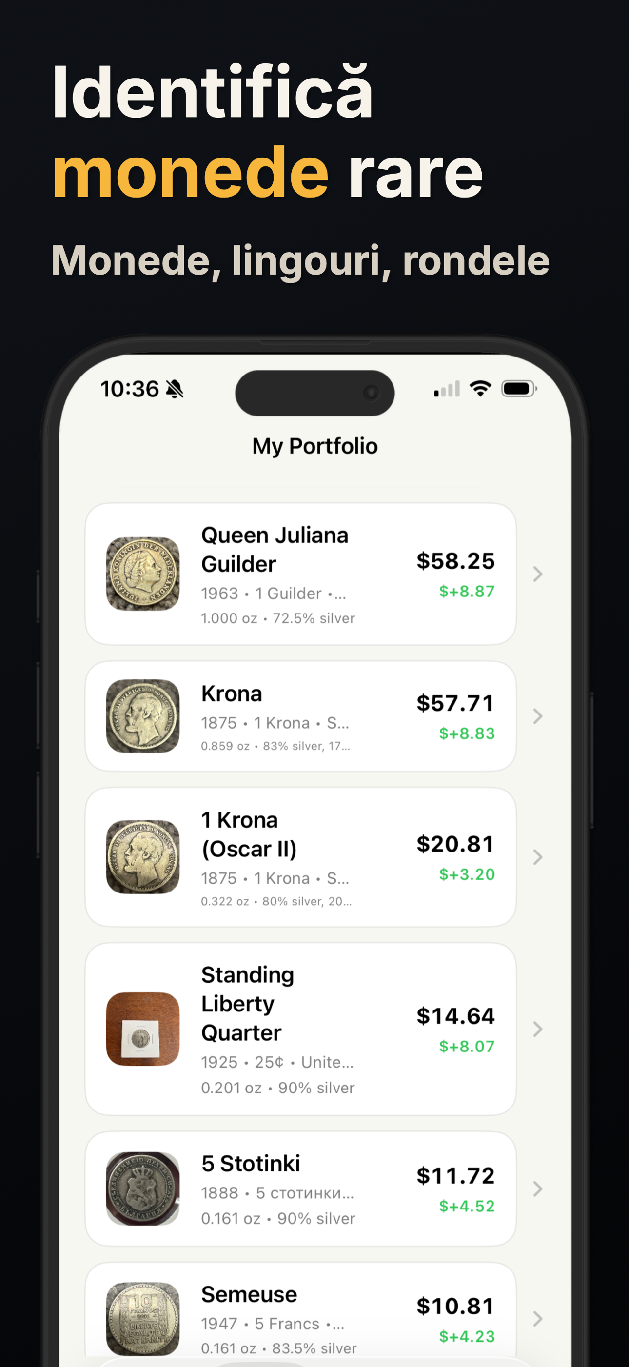 Fiecare scanare poate afișa numele monedei, țara, intervalul de ani, nominalul, compoziția metalică și o estimare a valorii când este disponibilă. Apoi poți salva rezultatul sau poți continua cercetarea dintr-un punct de plecare mai clar.